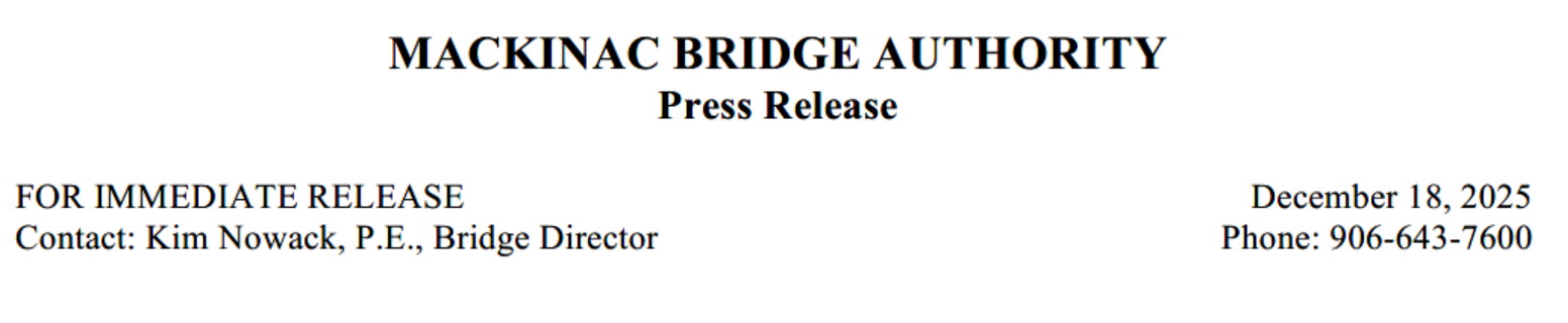 Kim Nowack, Bridge Director of the MBA, reported today that 455,829 vehicles crossed the Mackinac Bridge during the month of October compared to 451,731 in 2024.