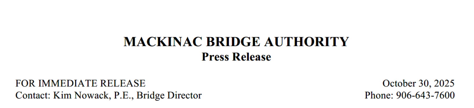 Kim Nowack, Bridge Director of the MBA, reported today that 486,406 vehicles crossed the Mackinac Bridge during the month of September compared to 502,868 in 2024.